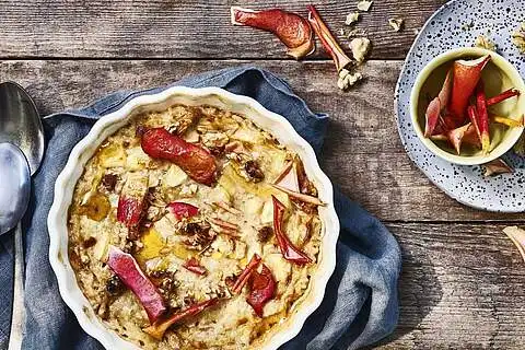 Die Masse in eine Backform geben und die grob zerbröselten Walnüsse darüberstreuen. Mit dem übrigen Honig beträufeln und im Ofen (Mitte) 15 - 20 Min. backen. Warm oder kalt mit Apfelchips garniert servieren. Gern auch mit warmer oder kalter Dessert Soße genießen.