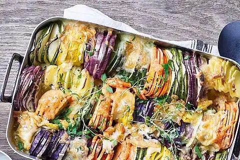 Das Gemüse waschen und trocknen. Die Kartoffeln und Karotten schälen und in dünne Scheiben schneiden. Zucchini und Aubergine ungeschält in schmale Scheiben schneiden. Das Gemüse anschließend bunt gemischt in einer Auflaufform schichten.
