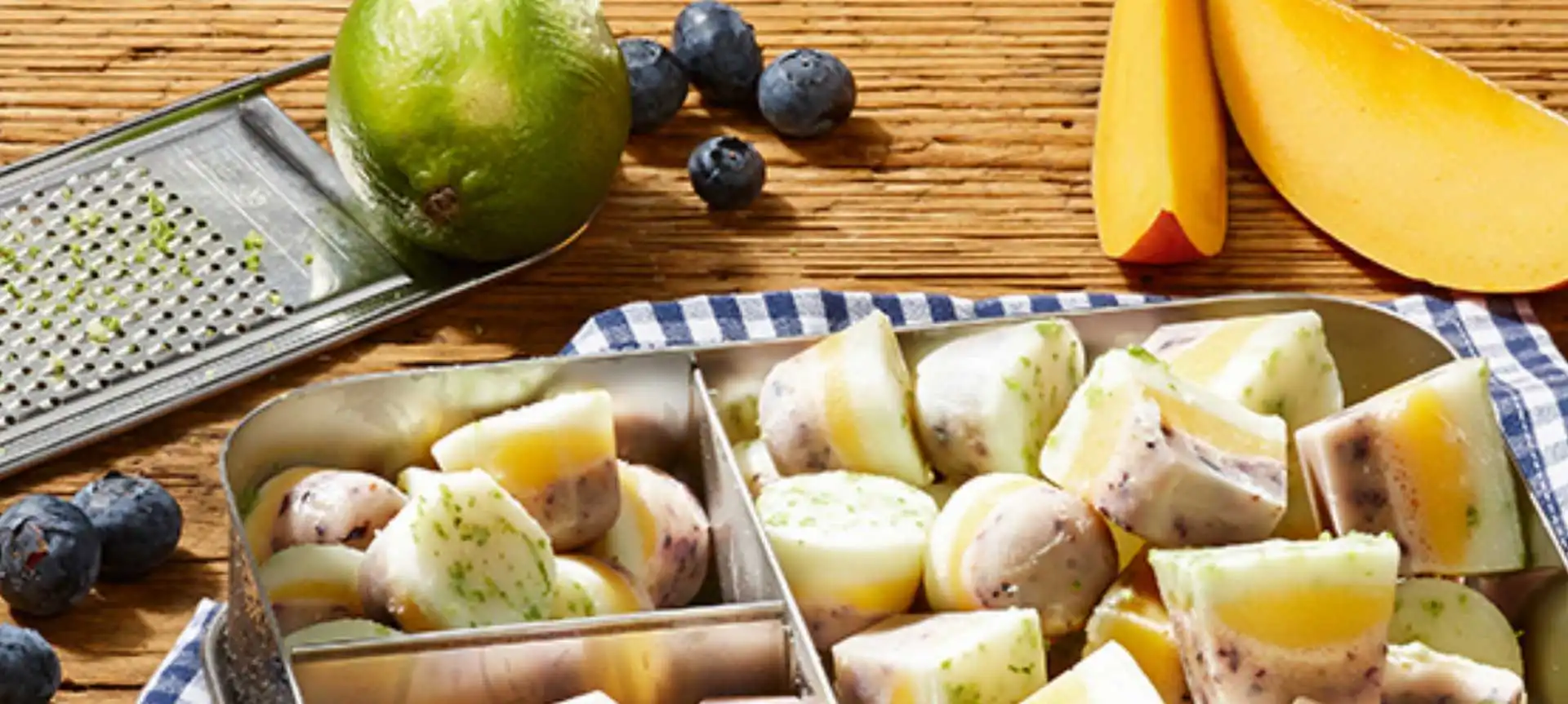 In die Eiswürfelformen zuerst eine Schicht Heidelbeer-Buttermilch Mix geben, darauf eine Schicht Mango-Buttermilch Mix und zuletzt eine Schicht des Minze-Buttermilch Mixes in die Form füllen. Mit Limettenabrieb bestreuen und für ca. 2 Stunden gefrieren lassen.