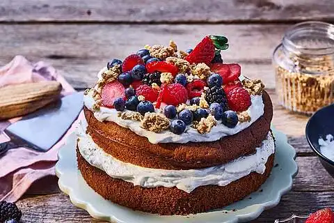 Die Sahne steif schlagen und dabei das Sahnesteif langsam einrieseln lassen. Quark und Puderzucker verrühren und die Sahne unterheben. Einen Tortenboden auf eine Tortenplatte setzen und ca. 2/3 der Sahne-Quark Creme darauf verstreichen. Den zweiten Boden aufsetzen und den Rest der Creme darauf verteilen. Mit Beeren und Crunchy Müsli dekorieren. Fertig ist der Naked Cake Erdbeer.