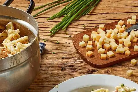Makkaroni, Milch, Sahne, 1 EL Butter und Muskatabrieb in einen Topf geben, aufkochen und abgedeckt ca. 10 - 12 Min. köcheln lassen. Dabei regelmäßig umrühren.