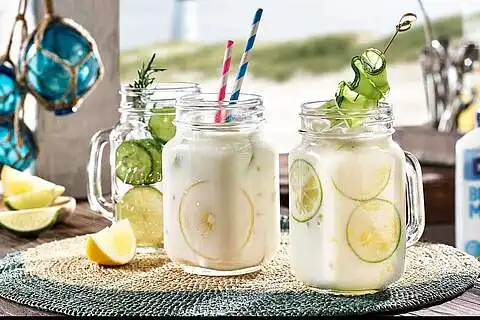 Das Eis mit den Zitronen- und Limettenscheiben in Gläser füllen. Den Zitronensaft darübergießen und mit Buttermilch Drink Zitrone auffüllen. Das Kaltgetränk anschließend mit den Gurkenspießen garnieren. Fertig ist das herrlich erfrischende Sommergetränk.