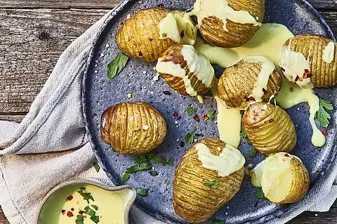 Die Fächerkartoffeln aus dem Ofen nehmen und mit dem warmen Käse-Dip, Chiliflocken und zerzupfter Petersilie servieren.