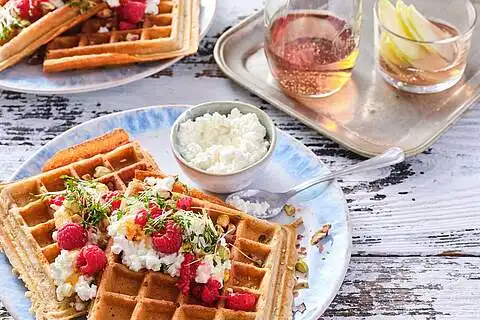 Ein Waffeleisen vorheizen (ggf. einfetten) und den Teig darin portionsweise ausbacken. Die fertigen Hafer-Buchweizen-Waffeln mit einem Topping aus Körnigem Frischkäse, Himbeeren, grob gehackten Pistazien, Kresse und Honig garnieren und warm genießen.