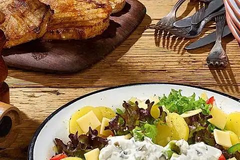 Paprika putzen, abspülen und klein würfeln. Sylter in Würfel schneiden. Endiviensalat putzen, abbrausen und klein zupfen. Als Salatbett in eine flache Schüssel geben. Kartoffeln mit Paprika und Sylter Käse vermengen. Mit Salz und Pfeffer würzen und auf den Endiviensalat geben. Zaziki darüber verteilen und mit Petersilie bestreuen.