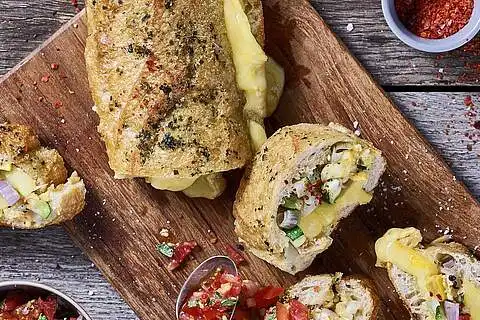 Backofen auf 180°C Ober-/Unterhitze (160°C Umluft) vorheizen. Baguette waagerecht halbieren, die Enden abschneiden und die Baguettekrumen bis auf einen ca. 1,5 cm breiten Rand aushöhlen. MILRAM Müritzer in kleine Würfel schneiden. PaprikaQuark mit der Schalotten-Zucchinimischung und Käse vermengen. Die untere Baguettehälfte mit der Käsecreme füllen und die obere Baguettehälfte auflegen. Baguette mit Kräuterbutter bestreichen, in Backpapier einschlagen und im Backofen ca. 20 Minuten backen.