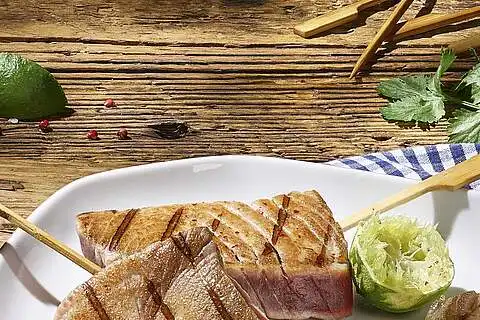 Thunfisch zuerst in ca. 1,5 cm dicke Scheiben schneiden, dann in Portionsstücke à ca. 75 g. Jedes Thunfischstück auf ein Holzspießchen stecken. Thunfisch mit etwas Öl einpinseln. Auf dem heißen Holzkohlegrill von beiden Seiten 1–2 Minuten grillen, sodass der Thunfisch innen noch roh ist. Thunfisch mit Salz und Pfeffer würzen. Die Tunfisch-Spieße zusammen mit dem Asia-Quark servieren. Nach Belieben mit frischem Koriander garnieren.