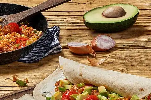 Tortillafladen mit jeweils 50 g der Kartoffel Creme bestreichen und mit der Hackfleischmischung und Avocadowürfeln belegen. Abschließend eng aufrollen und zum Servieren halbieren.