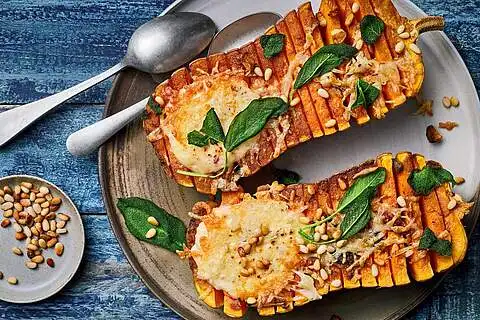 Die Pinienkerne fein hacken und mit dem PaprikaQuark vermengen. Den Kürbis aus dem Ofen nehmen und mit der Quarkmischung füllen. Mit Käse bestreuen und weitere ca. 10 Min. backen, bis der Käse goldbraun ist. Fertig ist das leckere vegetarische Herbstrezept.