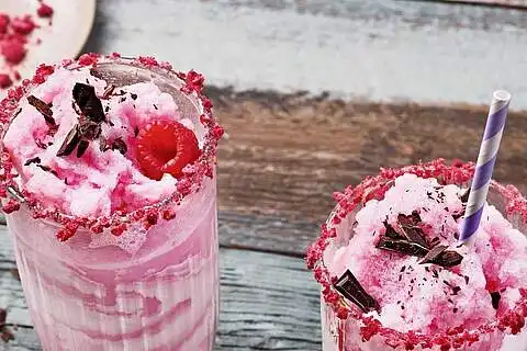 Buttermilch und Crushed Eis in einen Standmixer geben und cremig pürieren. Eine dünne Schicht Honig um den Rand der Gläser streichen. Die getrockneten Himbeeren zerbröseln und auf einen tiefen Teller geben. Die Gläser in die Himbeerbrösel tauchen und so einen rosa Glasrand zaubern.