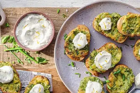 Das Baguette der Länge nach aufschneiden und mit der Knoblauchbutter bestreichen. Ein Backblech mit Backpapier belegen und die Knobi-Brote darauf 15 Min. goldbraun backen. Vor dem Servieren den FrühlingsQuark Wildkräuter auf dem warmen Knoblauchbaguette verteilen.