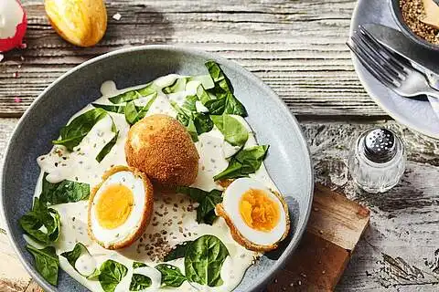 Die panierten Eier mit der Senfsoße auf einen Teller geben und mit gehacktem Spinat und Sesam toppen.