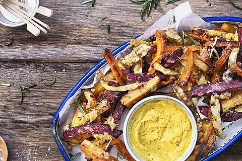 Die knusprigen Pommes mit grobem Salz bestreuen und mit dem Dip snacken.