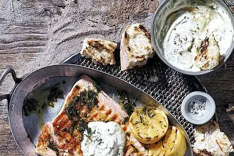 Lachs mit Honig-Senf-FrühlingsQuark-Dip auf Tellern anrichten und mit Röst-Baguette servieren.