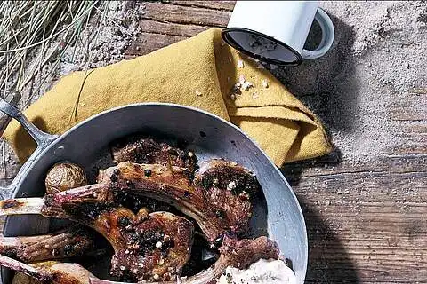 Lammkoteletts auf dem Grill ca. 5 - 7 Min. von jeder Seite grillen. Mit Kartoffeln und Zaziki auf Tellern anrichten und servieren.