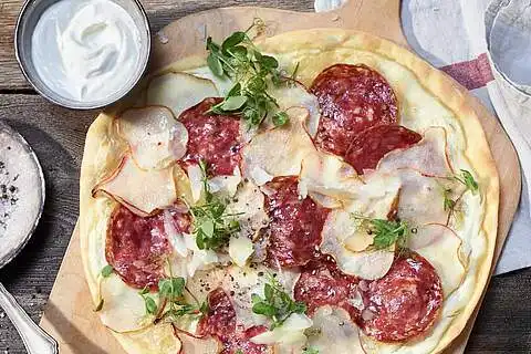 Für das Flammkuchen Rezept den Backofen auf 220°C (Umluft) vorheizen. Fenchelsalami in dünne Scheiben schneiden. Birnen waschen und in dünne Scheiben hobeln, dabei entkernen, wenn nötig und mit Zitronensaft beträufeln. Aioli mit Schmand verrühren. Beide Flammkuchenplatten mit Backpapier auf je ein Blech legen und mit Aioli-Masse bestreichen, dann mit Salami sowie Birnen belegen. 15 Minuten im Ofen auf der mittleren Schiene backen.