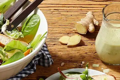 Für das Orange Ingwer Dressing: Die restliche Orange über ein Glas auspressen. Avocado halbieren, vom Stein lösen und das Fruchtfleisch auslöffeln. Das Fruchtfleisch einer halben Avocado mit dem ausgepressten Saft pürieren. Mit der Buttermilch verrühren, dem Ingwer, Salz, Pfeffer sowie Currypulver abschmecken.