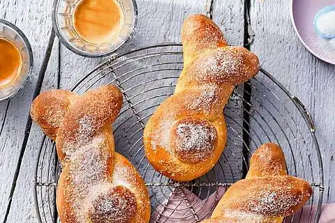 Den Quark-Öl-Teig in 7 Teile teilen. Aus einem Teigstück 6 Kugeln für die Hasenschwänze formen. Die übrigen Teigstücke ca. 30 cm lang ausrollen. Jeden Teigstrang zweimal überkreuzen und so zu Hasen formen. Je eine Teigkugel für den Schwanz auflegen und im Ofen (Mitte) 20 - 30 Min. goldbraun backen.