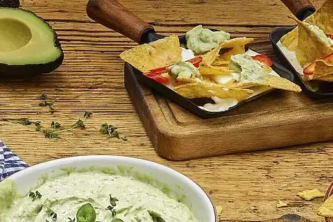 Die schnellgemachte und einfache Guacamole in kleine Schalen füllen. Kresse schneiden, den Dip damit garnieren und servieren.