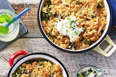 Reibekäse, Paniermehl und Butter mit den Händen zu einer krümeligen Masse verreiben. Die Käse-Mischung auf dem Orzo verteilen und im Ofen (Mitte) ca. 20 Min. goldbraun backen. Für den Dip den ButtermilchQuark mit dem übrigen Zitronenabrieb und -saft, gehackter Petersilie, Salz und Pfeffer verrühren und mit dem Orzo-Bake servieren.