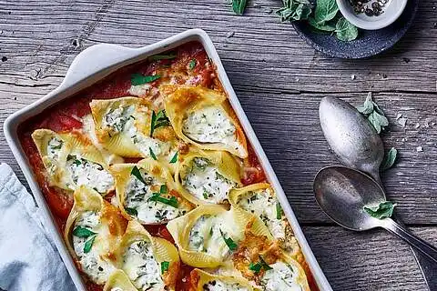 Die Tomatensauce in eine Auflaufform geben und gleichmäßig verteilen. Die Nudeln mit der Schmand-Creme füllen und mit der offenen Seite nach oben in die Auflaufform setzen. Um die Nudeln zu überbacken, mit MILRAM AuflaufLiebe bestreuen und 25 Minuten im Ofen (Mitte) goldbraun backen.