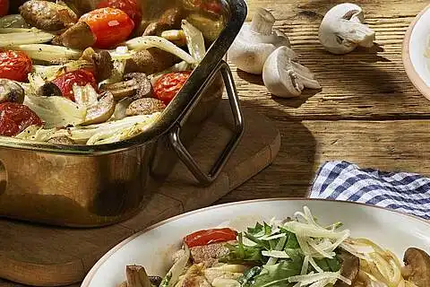 Backofen auf 200 °C Ober-/Unterhitze vorheizen. Fenchel putzen, halbieren, den Strunk entfernen, den Fenchel waschen und in Stücke schneiden. Champignons abbürsten und halbieren. Tomaten waschen, mit Fenchel, Champignons, 3 EL Öl, Salz und Pfeffer vermischen, in eine kleine Auflaufform geben und im Backofen ca. 10-15 Minuten garen. Die Tomaten dürfen ruhig etwas aufplatzen.