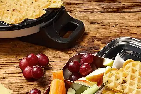 Gurke und Kohlrabi schälen, mit Apfel waschen und in mundgerechte Stücke schneiden. Waffeln mit Käsestreifen, Gurken, Kohlrabi und Apfel in eine Pausenbrotdose zum Mitnehmen verpacken. Schinken Käse Waffeln schmecken lassen!