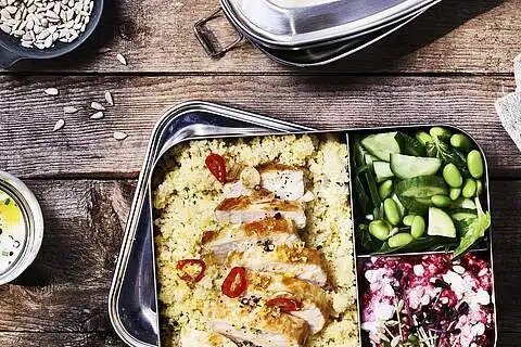 Eine Pfanne erhitzen und das Hähnchenfilet darin goldbraun braten. Mit Salz und Pfeffer würzen. Couscous und Hähnchenfilet ebenfalls in die Lunch Box geben.