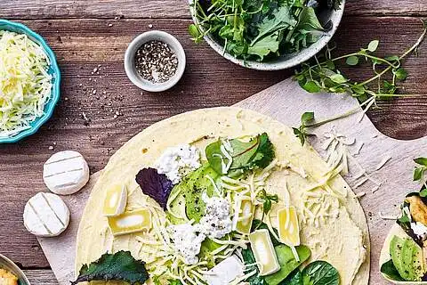 Für vegetarische Wraps: 35 g Sauermilchkäse in schmale Stücke teilen und die gefüllten Wraps damit belegen.