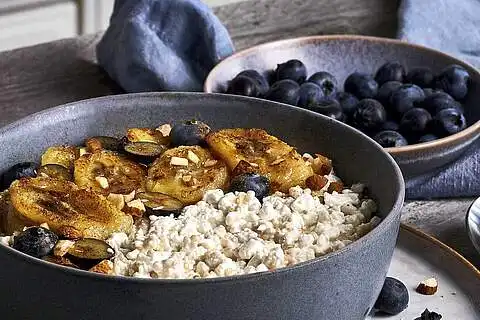 Währenddessen eine Banane mit einer Gabel zerdrücken und anschließend mit dem körnigen Frischkäse unter den Quinoa-Milchreis heben.
