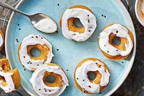 Die Kürbis-Donuts im Ofen (Mitte) 12 - 15 Min. goldbraun backen. Aus dem Ofen nehmen und vollständig abkühlen lassen. Den Puderzucker in eine Schüssel sieben und nach und nach den Schmand hinzufügen, bis ein zähflüssiger Guss entsteht. Die Pumpkin Spice Donuts mit dem Guss toppen und mit dunklem Sesam bestreuen. Zum leckeren Milchkaffee genießen - guten Appetit.