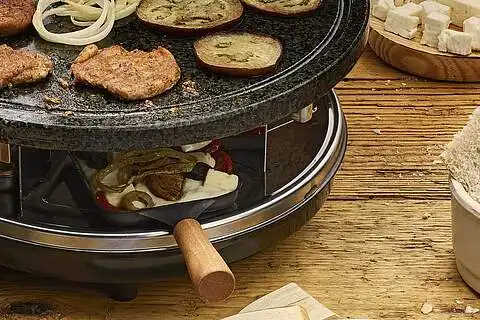 Gebratene Filetscheiben in Raclettepfännchen legen und mit etwas Zaziki bestreichen. Mit Auberginen, Tomaten, Zwiebeln, Oliven und Käse belegen und ins Raclette stellen, bis der Käse an den Ecken leicht braun wird. Mit Fladenbrot und übrigem Zaziki servieren. Tipp: Statt Schweinefilet kannst du auch Gyros aufs Raclette geben.