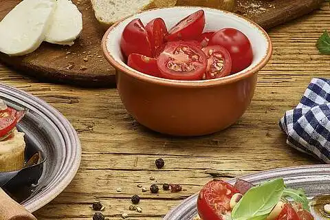 Schinkenscheiben vierteln. Rucola waschen und trockenschleudern. Tomaten waschen und halbieren. Für das Raclette Mozzarella in Scheiben schneiden. Raclettezutaten in kleine Schalen füllen oder auf Platten legen.