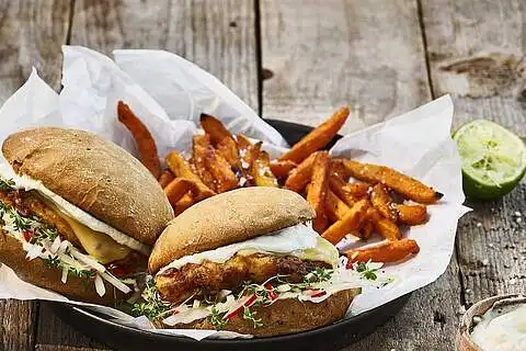 Die Burgerbrötchen mit Aioli bestreichen. Auf den unteren Brötchenhälften Cole Slaw verteilen. Hähnchen und Käse auflegen und die oberen Brötchenhälften auflegen. Fertig ist der selbstgemachte Hähnchen Burger.