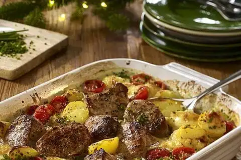 Tomaten waschen und halbieren. Burlander kleinschneiden. Eine Auflaufform (ca. 20 x 30 cm) fetten. Kartoffeln und Tomaten in die Form geben. Medaillons in die Mitte setzen. Soße darüber verteilen. Käse darauflegen.
