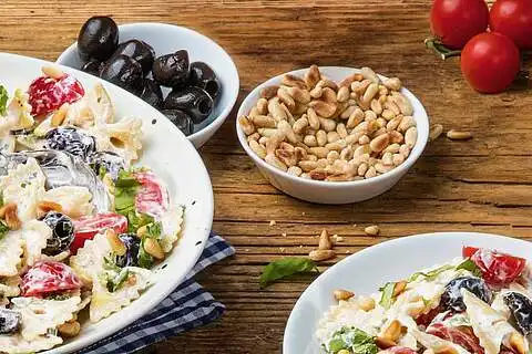 Für den Nudelsalat ohne Mayo zuerst Farfalle nach Packungsanweisung in reichlich Salzwasser al dente kochen.
