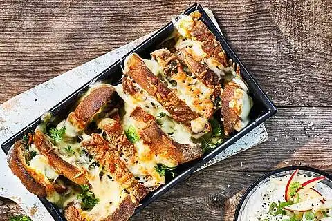 Die Hälfte des Reibekäses auf den Brotscheiben verteilen und das Brot anschließend in eine Kastenform geben. Den übrigen Käse darüberstreuen und das Zupfbrot mit Kräuterbutter im Ofen (Mitte) 10 - 15 Min. goldbraun backen.