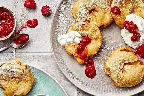 Die Apfel-Donuts aus der Pfanne nehmen und auf Küchenpapier abtropfen lassen. Die Sahne steif schlagen. Zum Schluss die Apfel-Quark-Donuts mit Puderzucker bestäuben und mit Sahne und pürierten Himbeeren servieren. Fertig ist das leckere Herbstrezept. Guten Appetit!