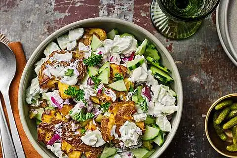 Die Kartoffeln aus dem Ofen nehmen und grob mit der Quarkmischung vermengen. Sofort servieren und nach Belieben mit frischen Kräutern toppen. Unser Smashed Potato Salat ist eine tolle vegetarische Alternative zum klassischen Kartoffelsalat – auch eine perfekte Alternative zum Weihnachtsklassiker mit Würstchen.