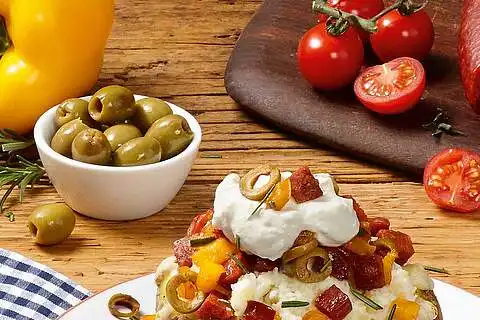 Kartoffel-Aioli-Mischung in die gratinierten Ofenkartoffeln füllen, mit Oliven, Kirschtomaten, Paprika, Chorizo und restlicher Aioli toppen und servieren.