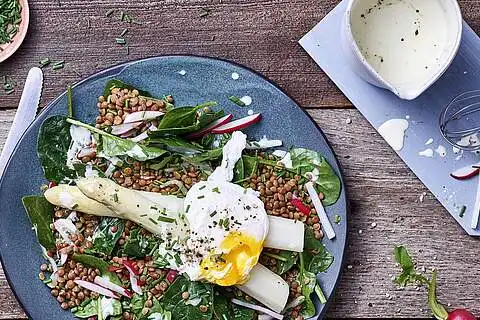 Den Spargel auf Tellern verteilen. Den Linsensalat und die pochierten Eier darauf verteilen. Mit Sahnesauce beträufeln und mit den übrigen Schnittlauchröllchen bestreuen.