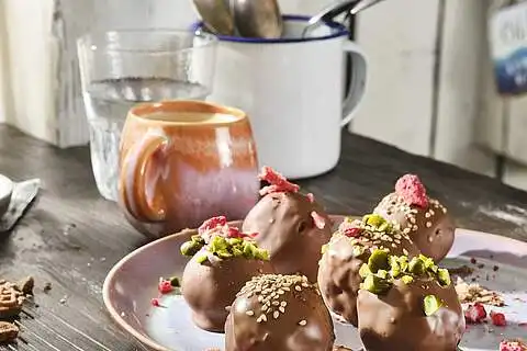 Die Plätzchenkugeln in die Schokolade tauchen und anschließend auf ein Backblech legen. Mit Pistazien, Sesam oder getrockneten Früchten bestreuen und trocknen lassen. Fertig ist das süße Gebäck.