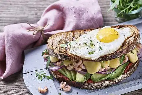 Eine Brotscheibe mit Ketchup bestreichen und in Schichten mit Zwiebelringen, Avocado, Krabben und Nordlicht belegen. Das Sandwich im Kontaktgrill (oder vorgeheizten Ofen) knusprig backen, bis der Käse geschmolzen ist. Alternativ kann auch ein Sandwichmaker verwendet werden.