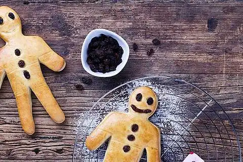 Rosinen als Augen und Knöpfe eindrücken, Mandelstifte als Mund eindrücken. Eigelb mit Milch verquirlen und Stutenkerle damit bestreichen. Für ca. 16 Min. goldbraun backen.