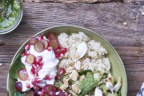In einer Schüssel nebeneinander gebackenen Blumenkohl mit Pesto, Quinoa und Spinatblätter mit Dressing anrichten. Gehackte Erdnüsse über Quinoa streuen. Mithilfe eines Löffels den Traube-Granatapfel-Quark in der Mitte der Schüssel anrichten.