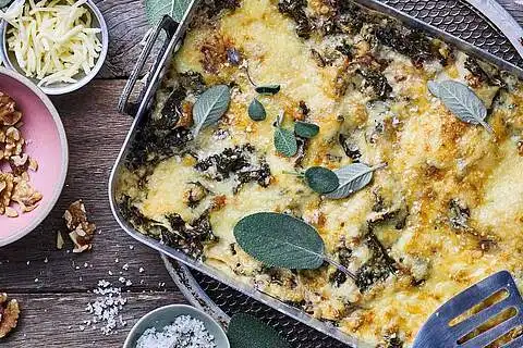 Mit Käse bestreuen und die Salbei Blättchen darauf geben. Die vegetarische Lasagne im Ofen (Mitte) 30-35 Min. goldbraun backen. Fertig ist die leckere Grünkohl Lasagne.