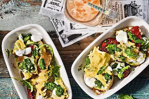 Pesto, Schmand-Alternative und die getrockneten Tomaten auf den Pulled Potatoes verteilen und mit Auflauf-Liebe bestreuen. Erneut in den Ofen schieben und ca. 10 - 15 Min. überbacken, bis die Raspel geschmolzen sind. Mit Rucola bestreuen und das vegetarische Kartoffelgericht servieren.