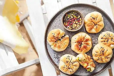 Das Öl in einer Pfanne erhitzen und die gefüllten Bao Buns darin 3 - 5 Min. pro Seite goldbraun braten. Nach dem Braten die asiatischen Teigtaschen mit Sesam bestreuen und auf einen Teller geben. Aus Sojasoße, fein gehackter Chili und der übrigen Frühlingszwiebel eine Soße anrühren und zum Dippen dazu servieren.