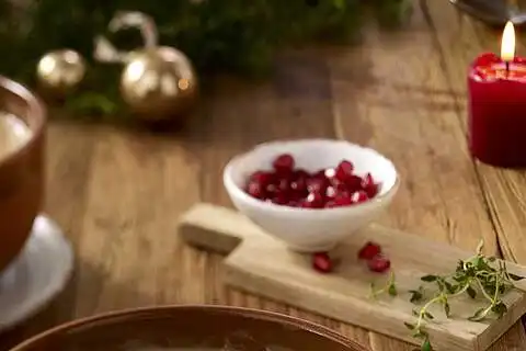 Aus der Granatapfelhälfte die Kerne herausklopfen. Thymian waschen, trocken schütteln und die Blättchen von den Stielen zupfen. Suppe in Schalen anrichten. Je 1/2 EL MILRAM FrühlingsQuark als Klecks darauf geben. Mit Thymian und Granatapfelkernen garnieren.