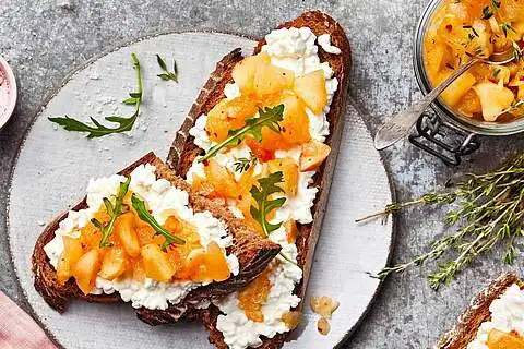 Das Apfel-Chutney vom Herd nehmen, in sterile Gläser füllen, verschließen und vollständig abkühlen lassen. Besonders lecker schmeckt das Chutney zu würzigem Käse oder Körnigem Frischkäse. Dazu eine Scheibe knuspriges Bauernbrot mit Körnigem Frischkäse oder zwei Scheiben Käse (z.B. Nordlicht) toppen, Chutney darauf verteilen und mit Rucola bestreuen.
